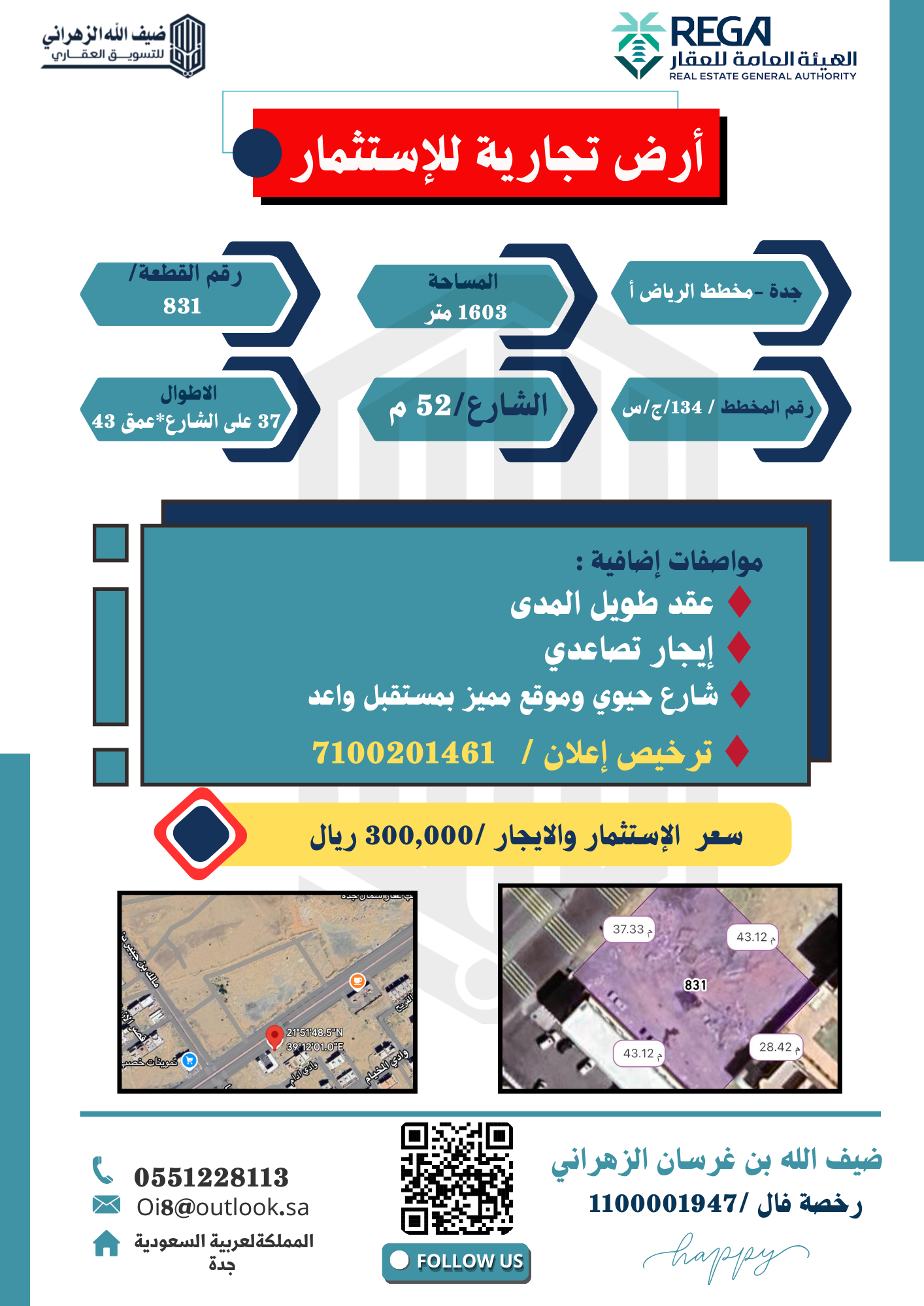 ????*قطعة تجارية* ????للإستثمار أو الإيجار ???? الموقع???? ????جدة مخطط الرياض جزء أ ????المساحة 1603 متر ???? الشارع 52 تجاري ????الواجهة / شمال ????الأضلاع متساويه ????طول الضلع على الشارع 37 متر ????عمق الضلع الداخلي 46 متر ♻️مواصفات إضافية • عقد طويل المدى • قيمة العقد تصاعدي •الموقع مناسب للاستثمار وبمستقبل واعد ✅قيمة الإيجار كالتالي: • الخمس السنوات الأولى/ ٣٠٠ الف لكل سنة • الخمس السنوات الثانيه/ ٣٥٠ الف لكل سنه • الخمس السنوات الثالثه/ ٤٠٠ الف لكل سنه ♦️الاسعار قابلة للتفاوض وتتحدد على نوع ومدة النشاط ♦️ للوصول للعقار???? https://maps.app.goo.gl/aschWcrBg7A1Ghgs7 ✅للاستفسار والتواصل ضيف الله بن غرسان الزهراني وسيط عقاري معتمد ‎055 122 8113 ????نسعد بخدمتكم ونسعى لإرضائكم????